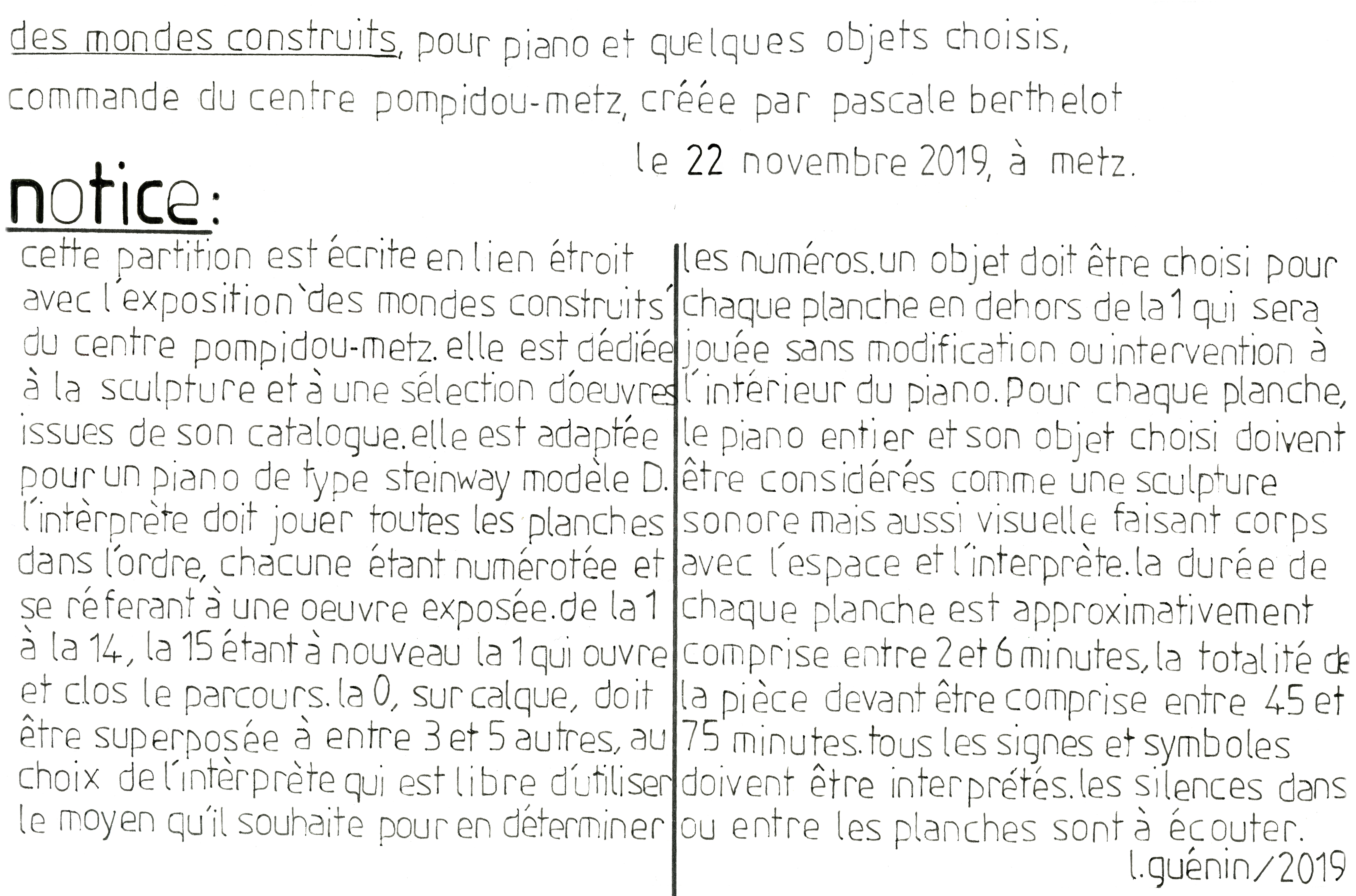 A l’invitation du Centre Pompidou-Metz, Loïc Guénin se consacre à l’écriture d’un cycle de pièces pour piano et quelques objets choisis. Interprétée par la pianiste Pascale Berthelot, la pièce est pensée en 13 mouvements qui, chacun, se consacre à une œuvre, un artiste, un process et s’applique à suivre le parcours de l’exposition Des Mondes construits. Un choix de sculpture du Centre Pompidou.